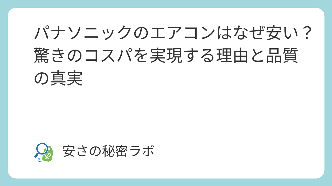 パナソニックエアコン なぜ安い	パナソニックエアコン 評判, パナソニックエアコン デメリット, パナソニックエアコン 安い時期, パナソニックエアコン おすすめ, パナソニックエアコン 寿命	panasonic-aircon-cheap-reason	ファッション・家電	パナソニックのエアコンはなぜ安い?驚きのコスパを実現する理由と品質の真実	パナソニックのエアコンがなぜこれほど安いのか、その納得の理由を徹底解説。型落ちモデルの在庫処分や大量生産の仕組み、独自機能「ナノイーX」など安さの秘密と賢い選び方を紹介します。